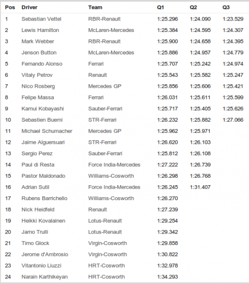 Sesto si è qualificato Petrov sulla Lotus Renault. Al settimo posto troviamo Rosberg sulla prima Mercedes, che precede Massa, Kobayashi e Buemi.